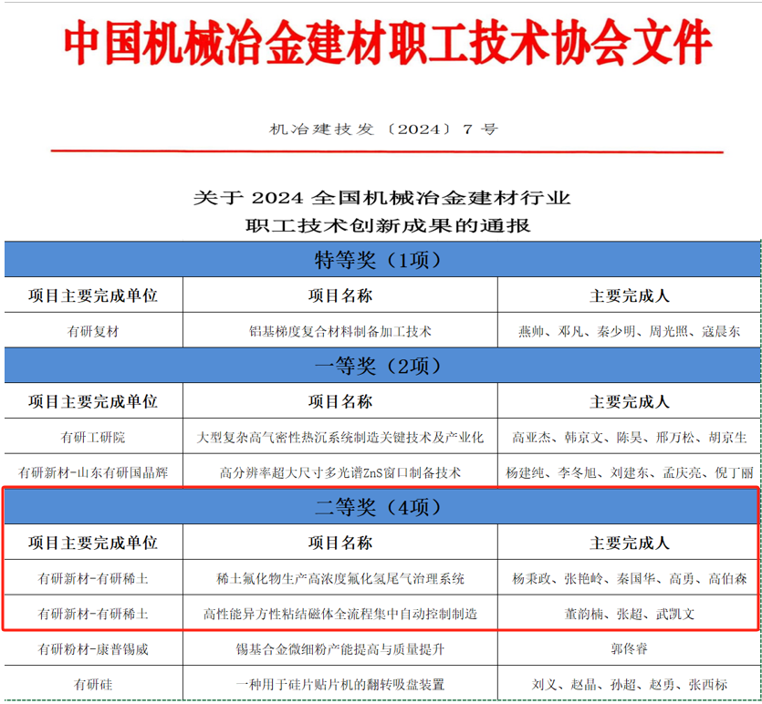 近日,2024年全国机械冶金建材行业职工技术创新成果评选揭晓,中国有研申报的7项创新成果均获奖,其中,有研稀土2项职工创新成果荣获全国机械冶金建材行业职业技术创新成果二等奖。